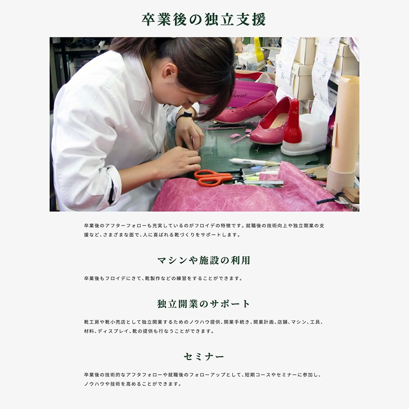 「足にトラブルがある方もない方も、全ての方に履 き心地がよい靴、歩きやすい靴をご提案できる人を育成する」というコンセプトのもと、オートペディシューマイスターの教育カリキュラムに則った靴作りのプロを育成する学校として、アルカ・グループが運営しています。 フロイデは、日本で唯一の本場ドイツの公立靴専門学校の姉妹校です。 ドイツや日本の第一線で活躍する講師陣により、本場のカリキュラムや工具を使った伝統のある技術を学ぶことができる学校です。